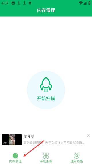 1、点击内存清理页面,以绿色为主色调,中间有开始扫描按钮,底部有广告。