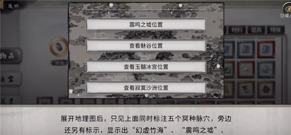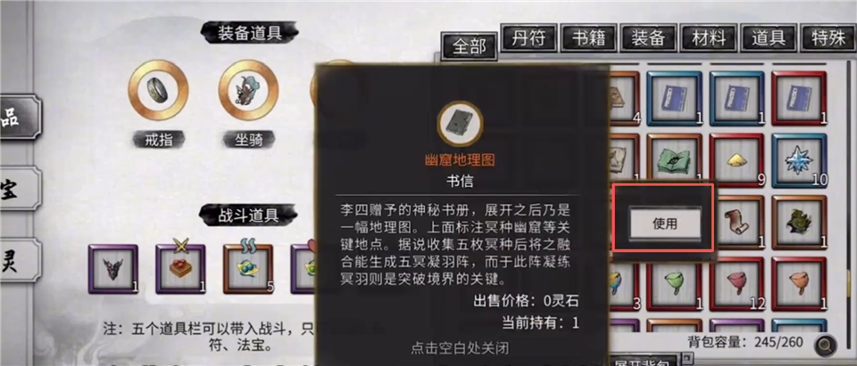 2、然后走出宗门获得李四送来的地图,在背包里使用可查看突破材料的位置。