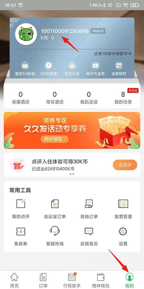 1、打开格林酒店App,点击我的-个人头像;