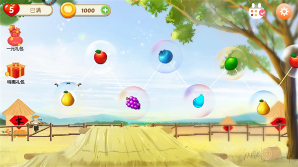 游戏画面清新精美,拥有Q版的游戏场景,不仅上手简单、休闲有趣,还搭配精心设计的水果元素,以果园及农夫为背景主题,给人超清爽舒适的感觉,为玩家带来体验一把丰收的快乐。