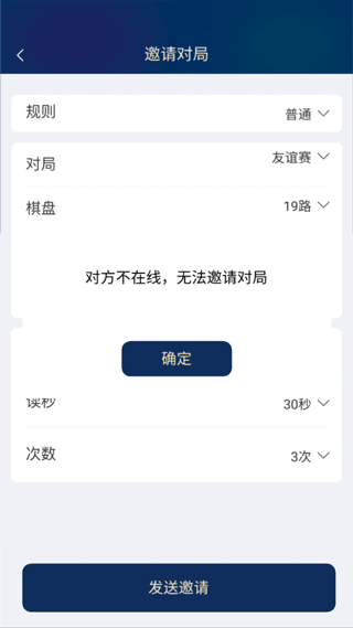 4、然后再设置对弈规则、对局模式、棋盘路、执子规则、棋份、局时、秒读和次数,最后点击邀请就可以啦!【注:要保证朋友是在线的,不然就无法邀请对局】