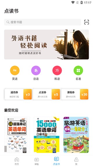 1、首页界面可以使用点读书,热销课程,免费音频,有声书,背单词,查词汇等功能