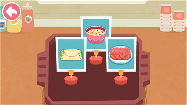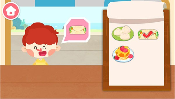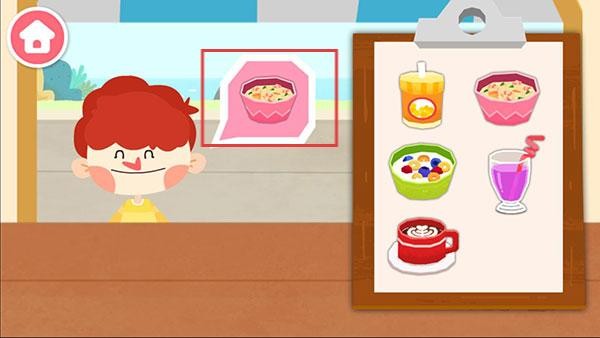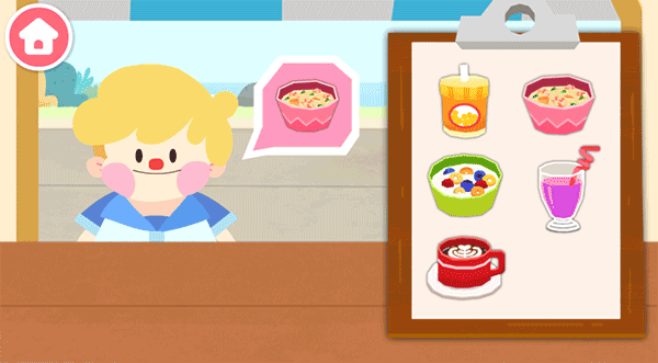 1、宝宝巴士早餐车中会有顾客提出需求如第一张图中孩子想要一碗食物,玩家需从菜单中识别并选择对应的食物。