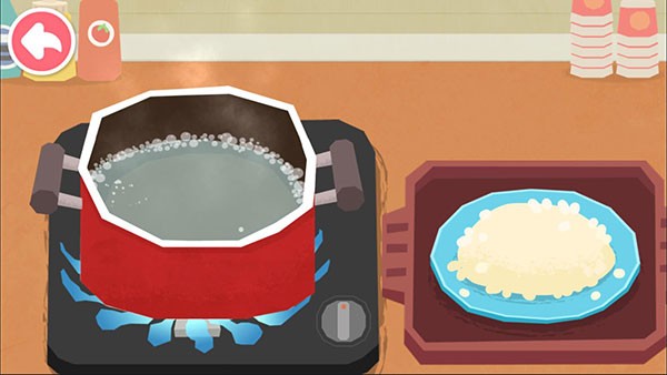 2、根据所选食物收集食材并进行烹饪操作,像第三张图中可能是在煮食材,通过点击拖动等简单操作来完成烹饪步骤,如开火、搅拌、装盘等。