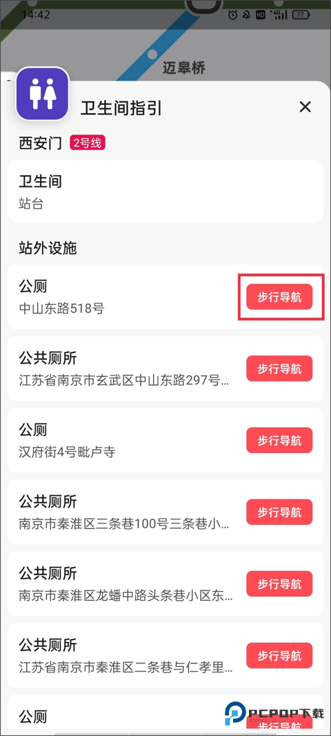 3、页面展示了该站附近的所有公共卫生间位置。选你要去的那个,点击右边的步行导航图标,立刻就能引导你过去。