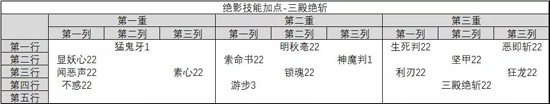 加点说明:技能加点神魔判只点1,因为点满伤害不高且容易躲,1级只用来触发标记和回血。放弃伏法令,主要是技能范围小且同样容易躲,而且学了封神技能后,绝影是不缺伤害技能的。不过这套加点标记容易溢出,多学个伏法令也可以。