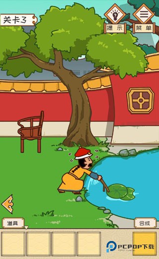 第3关:看到旁边的椅子没?踩上它,够着树枝,成功获取一根长长的树枝。然后拿着树枝去荷塘场景试试,伸进水里搅和搅和,嘿,一片大大的荷叶就到手了。