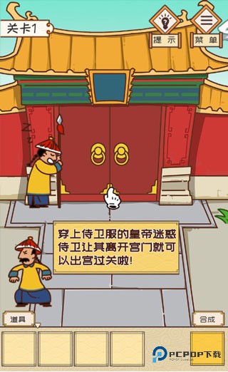第1关:先挪动手指滑到最右边的场景瞅瞅,有套现成的侍卫衣服在那儿摆着呢。赶紧让咱们皇上穿上这身行头。换装完成后,别犹豫,直接点击大门那块儿,轻轻松松迈出去,搞定!