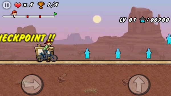 在加速的过程中要注意,由于自行车的助力方式是脚蹬,所以加速的时候要连续点击才能加速。这对于跳跃某些范围比较大的障碍有一定的帮助,此外,游戏内在不同节点设置了存档,路过即会自动存档,不过挑战的机会有限,要把握!