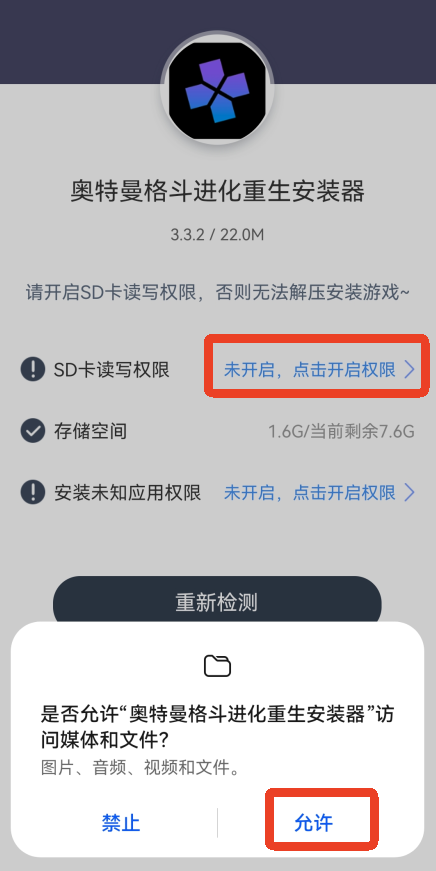 1、以华为手机为例,下载后先允许安装器访问媒体和文件,点击下方【允许】,或者点击蓝色字开启权限。