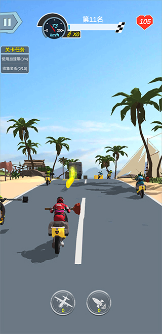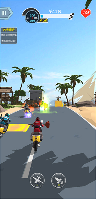 3、在赛道上会有武器道具可以拾取,拾取可以进行攻击对手摩托。