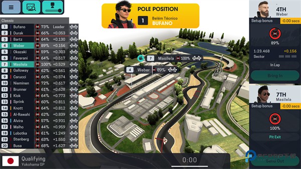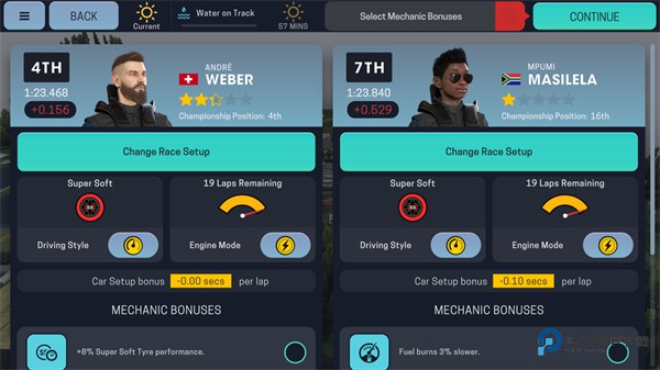 4、车手实时数据:你的车队两名赛手的核心信息显示在屏幕的左右下角。这包含了控制进站操作、策略调整以及车手状态管理的入口。展示的具体数据有:当前名次、所处赛道区段、与前后车的距离差、剩余燃油量、轮胎磨损值,以及当前驾驶模式对油耗和轮胎磨损造成的影响。