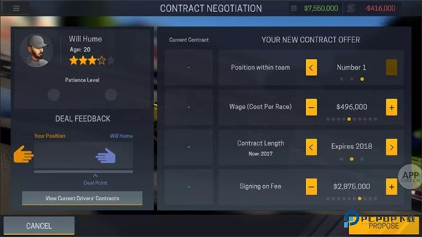 车手及工程师的合约谈判过程充满策略性。你拥有完全的控制权,可以随时执行解约或启动新签约。当然,任何合约变动都需要资金支持,与车手协商尤其耗费预算。谈判时,你需要精心设定合约期限、签字费金额以及单场比赛的报酬标准,确保这些条件既能打动车手接受,同时又不超出车队能够承受的财务预算范围。