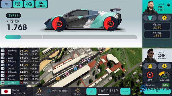 5、时间管理与信息总览:比赛过程中支持暂停时间和加速时间流动。可以随时查看当前进行的圈数和整场比赛的总圈数。屏幕顶部区域会显示重要的辅助信息:赞助商设定的任务目标、天气预报情况、当前赛道湿度、路面抓地力变化以及来自数据中心的提示或分析。