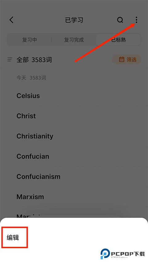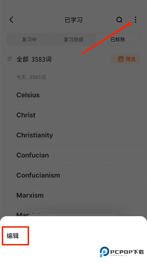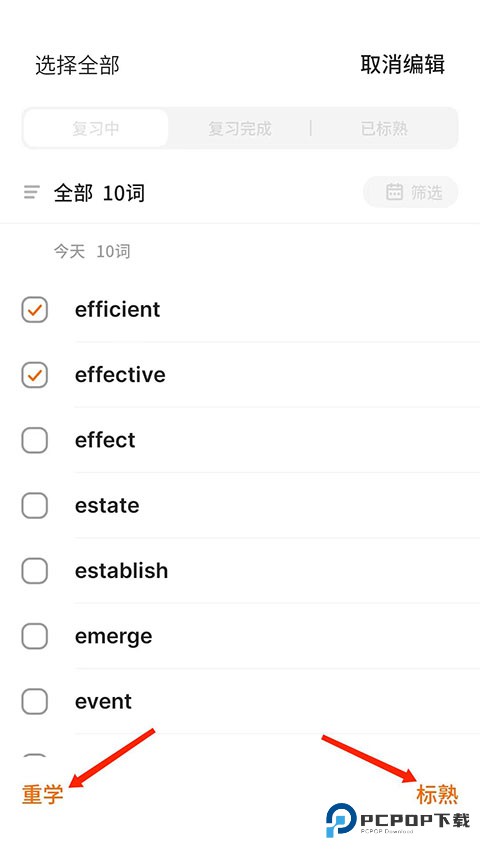 4、勾选目标单词,选【重学】重置进度,或【标熟】跳过复习。
