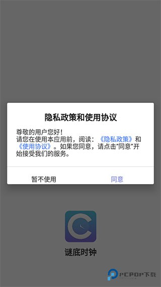 1、把谜底时钟 APP 装好并打开它,第一件事就是同意弹出的操作协议。