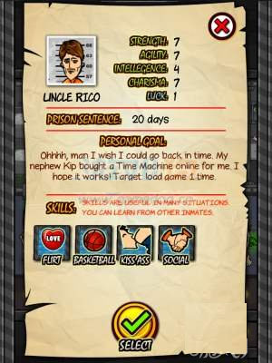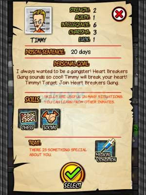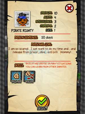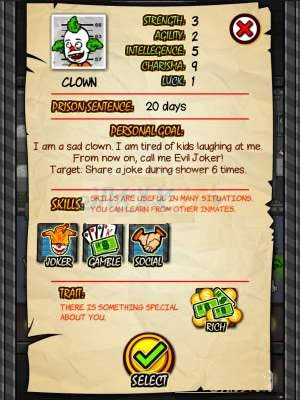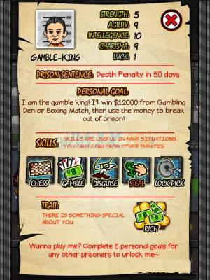 新游戏:从100位囚犯中选择一名开始游戏,每名囚犯的坐牢时间,甚至将被处以死刑日期不同,掌握技能不同(详见技能篇:)