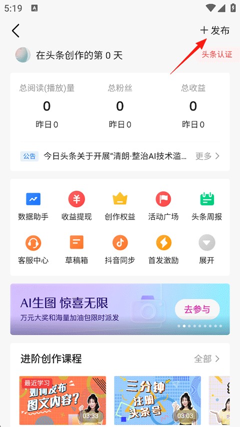 1、打开今日头条APP,点击“我的”-“创作中心”;