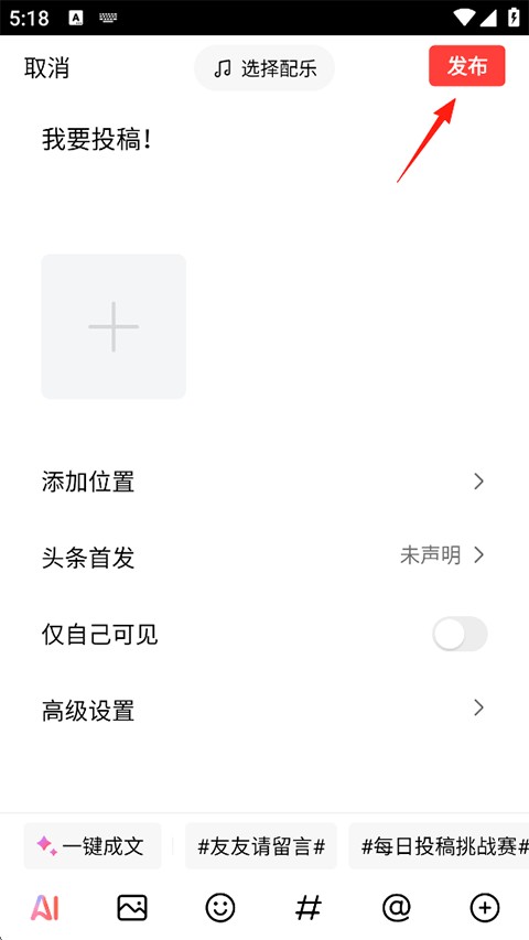 3、开始创作,填写内容、上传图片、添加配乐等,完成后点击“发布”;