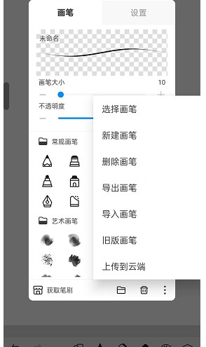 第二步:点击下方工具栏中的画笔库,我们进入到【画笔】的界面,这里就是软件自带的所以笔刷了,点一下右下角的三个点,会弹出一个小窗口,我们可以在这里选择、新建、删除、导出或者导入笔刷;