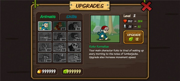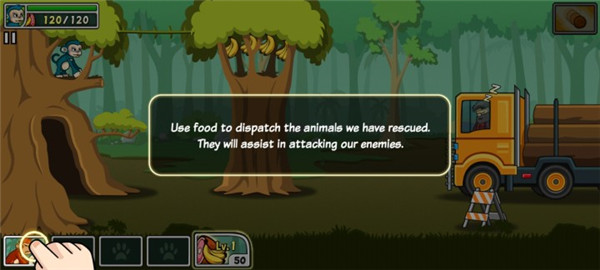 森林防御战猴子传奇最新版(Lumberwhack)是一款有创意的策略塔防游戏,游戏有着丰富多彩的游戏场景,而且游戏的画面设计也非常的经典,游戏不单单需要玩家活动头脑打败入侵者,同时故事还积极传达了保护环境的意识。在这样的故事背景下,玩家也化身为环保小卫士,和动物们站在同一战线,运筹帷幄,给那些破坏生态环境的人类一点颜色瞧瞧!在游戏中,玩家将要控制一只机灵的猴子,带领它的小伙伴们完成一场场家园保卫战,这虽然是简单的对推式塔防,不过在玩法机制上和同类作品还是有些不一样的地方,比如小猴子下树后还可以上树,香蕉会固定时间刷新,升级系统可以查看往后几个等级,椰子壳可以给一些动物当武器等,非常的有意思。