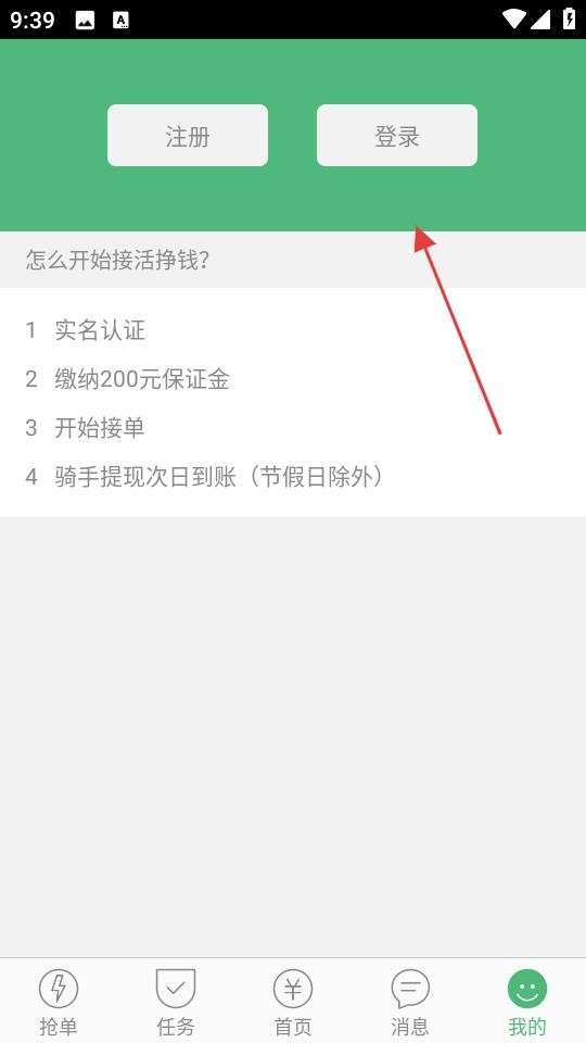 1、我的页面,有注册、登录按钮,还展示接单挣钱流程,先实名认证,缴纳200元保证金,之后开始接单,提现次日到账。