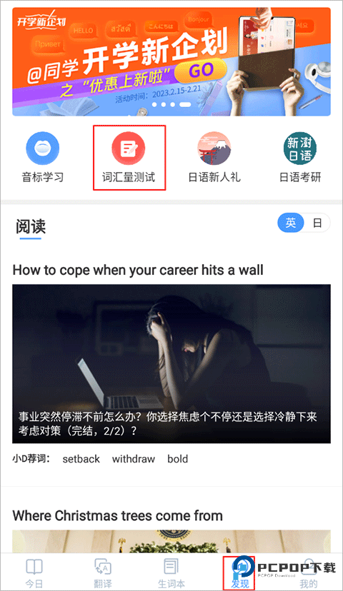 1、进入 APP 发现页选择 "词汇量测试"。