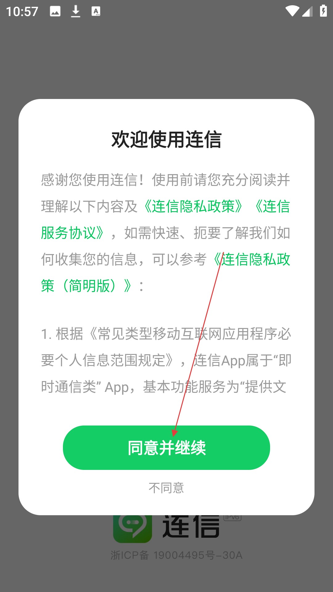 1、在连信欢迎页面点击【同意并继续】按钮进入登录引导页面。