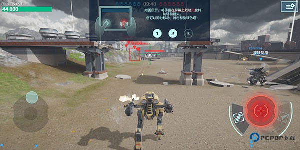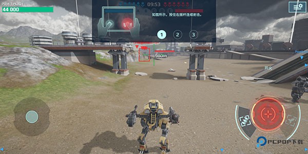 3、长按屏幕右侧的虚拟摇杆不松手,机甲会持续发射主武器攻击敌人。