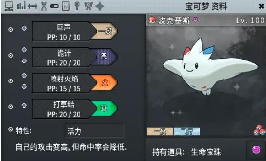 道具:生命宝珠,用了一段时间,真的感觉比博识眼镜好用。命玉保证了波克基斯的伤害,虽然会掉血,但是可以保证一回合配合队友秒杀对方,比如岩崩+巨声打暴鲤龙,命玉就一定能打死,而博识眼镜就不一定。