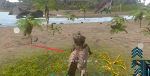 当我们将恐龙打晕之后,恐龙头上会出现一个带有紫色条的对话框,然后按e打开我们的背包,然后将食物投放到中间恐龙的背包当中,恐龙会吃掉这些食物,但是恐龙的负重是有上限的;