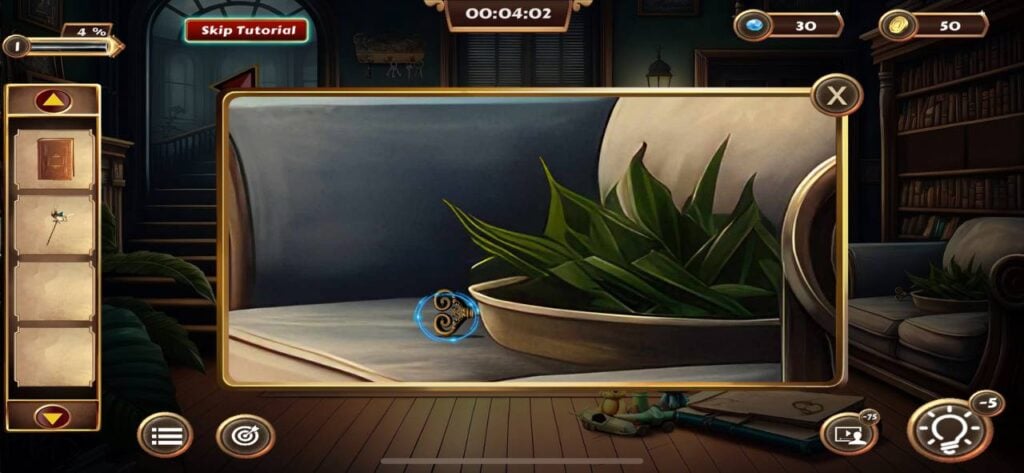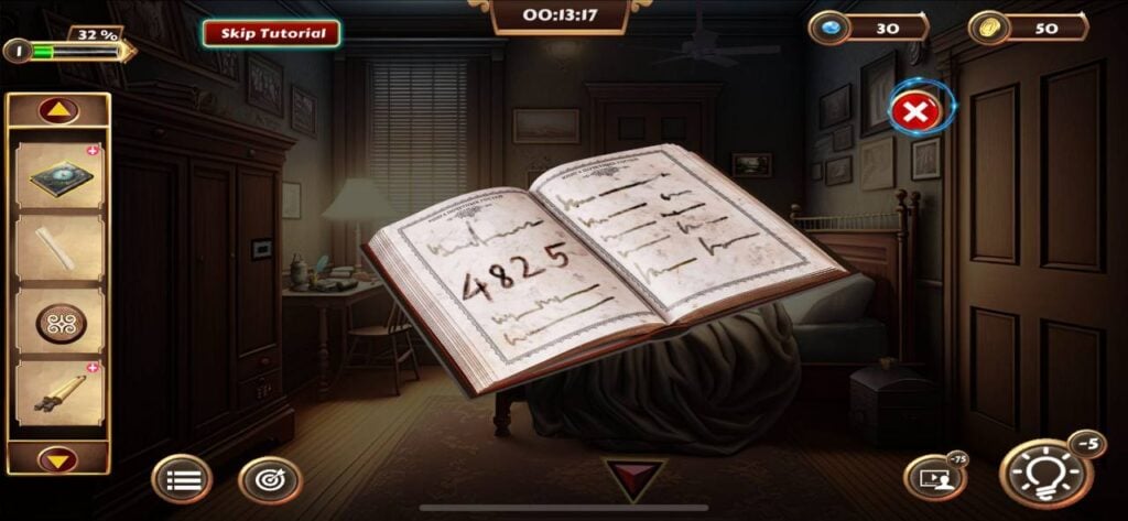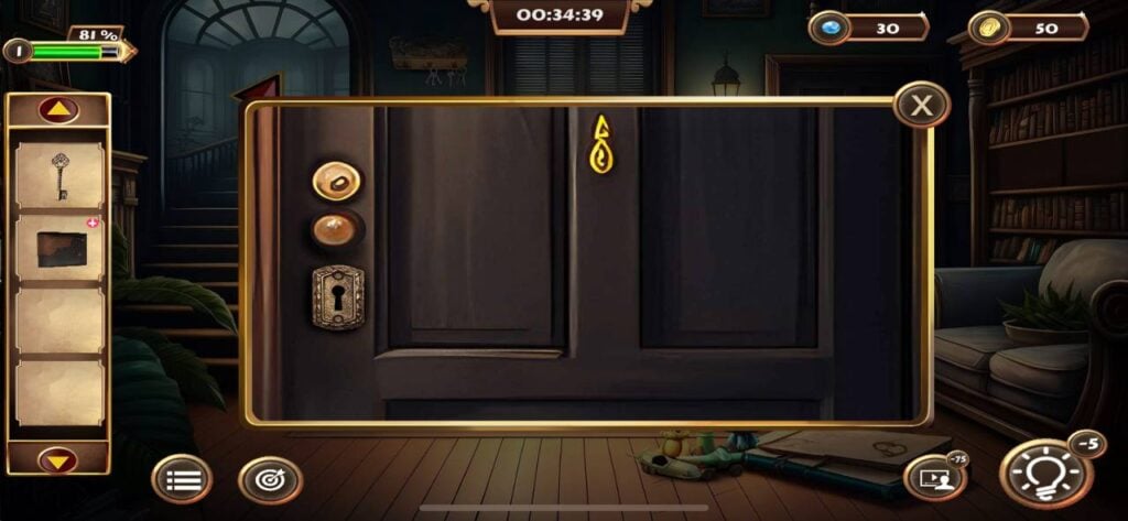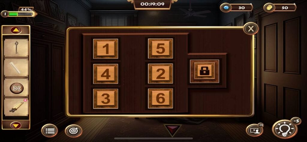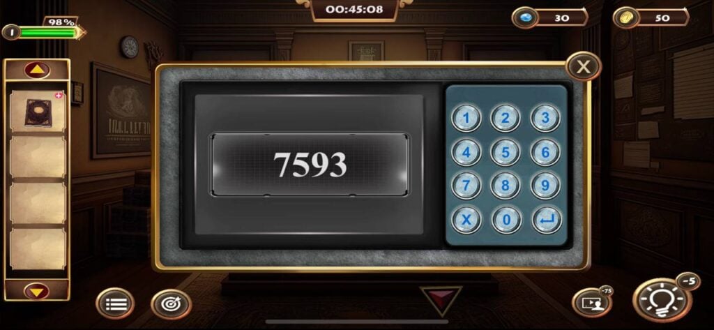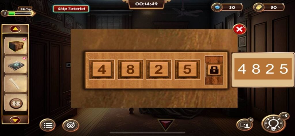 一旦你找到秘密钥匙,点击并拾取右侧门旁架子上的小盒子。通过物品栏菜单打开这个盒子,然后输入4位密码“4825”。