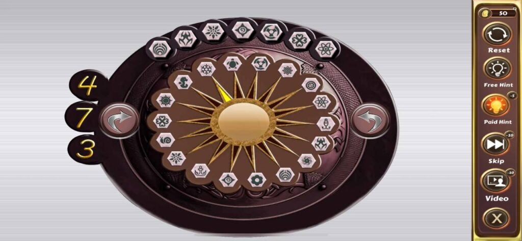要完成这个谜题,玩家需要使用左右箭头将谜题顶部的七个符号匹配起来。左箭头顺时针移动,右箭头逆时针移动。3、7 或 4 表示在所选方向上跳过的格数。