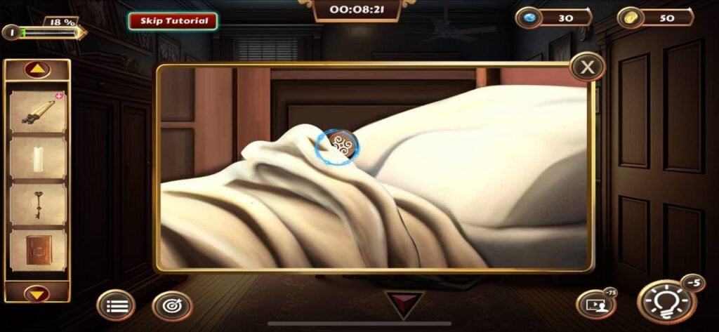 现在点击床铺,拨开毯子找到纽扣碎片。点击纽扣碎片即可收集。