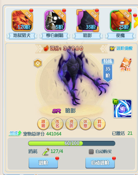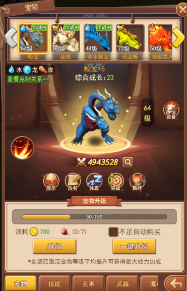 激活后的宠物可以通过使用一定数量的宠物口粮和金币进行升级操作,升级后的宠物会获得更加强力的属性!