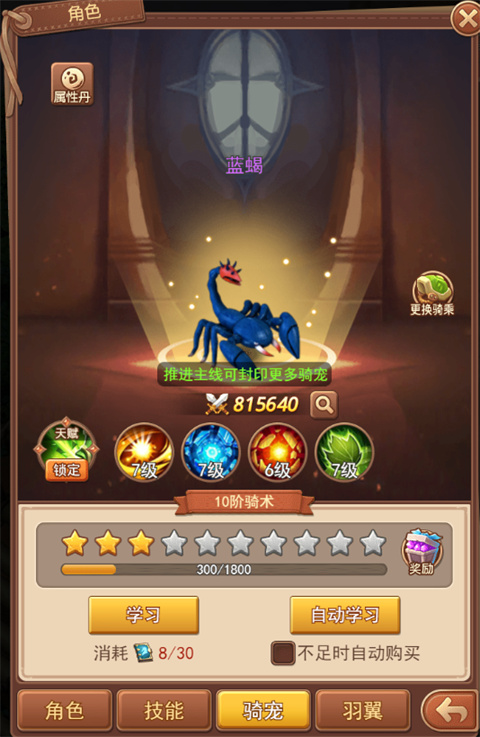 在骑宠升级到一定阶段后,玩家可以通过使用骑宠属性丹的方式来直接获得大量战力,需要注意的是,一定等级的骑宠可使用的骑宠属性丹是有数量上限的。