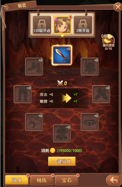 锻造系统目前分为强化、精炼、宝石三个子系统,分别有不同的开启条件。