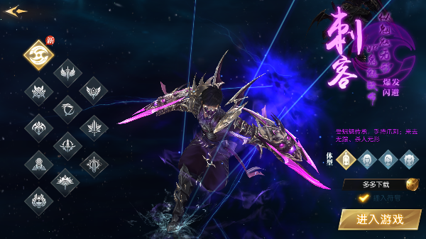 刺客这一职业操作难度上的要求比较高,非常适合用于pk与切磋,他拥有十步杀一人,千里不留行的特点,他们藏匿在阴影中,悄声无息的靠近敌人,在恰当的时机给予敌人致命一击;没人知道他们究竟在哪,对敌人形成无形的恐惧!