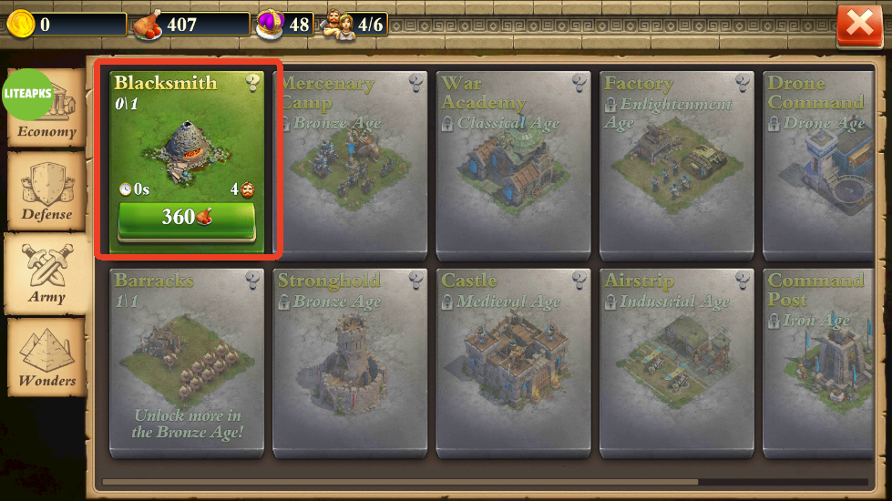 • 在每个时代升级您的基地和军队。