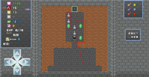 3、地图内会散布各种道具,可以以触碰的方式拾取,像红药水和蓝药水可以恢复补充我们的蓝量