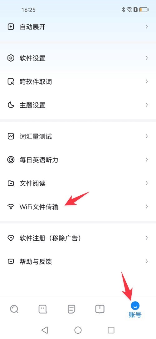 1、以欧路词典为例, 点击帐号Tab下WiFi文件传输;