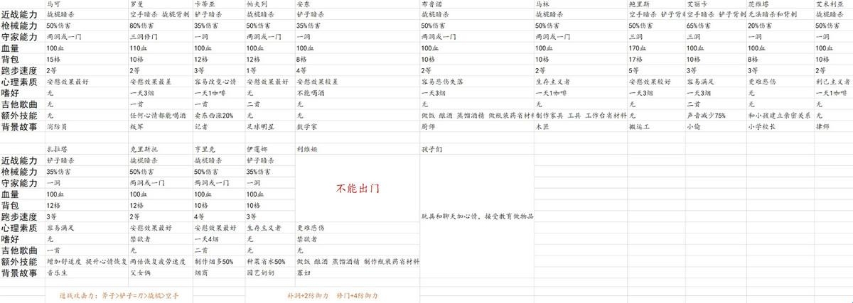 7、别墅废墟有时候是逃兵,有时间是普通人,喷子守家比步好使,多听收音机,按照收音机上说的积攒咖啡、烟草、蔬菜,用这些当货币跟奸商换,不同时期可以换到更多,大厨费烟,十六格贼玻璃,小偷可以无隐藏背刺,但是玩不了脚步杀人,两老人会时常有社区送温暖,消防员是刚刚开始开荒比较好用的一个,足球运动员快跑基本是打不中的,律师可以砍价,马林的话和十六格配合是最奈斯的。