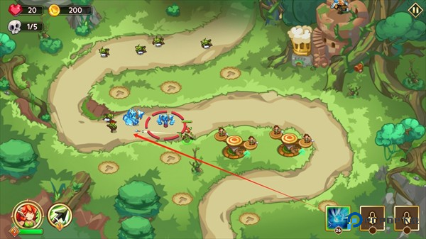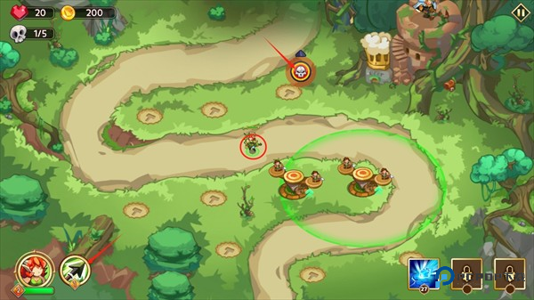 3、英雄就在战场等你操控。留意屏幕左下角的小圆圈,那是英雄的强力技能。造好塔别忘了点右边那个骷髅头按钮,让敌人进攻开始吧!