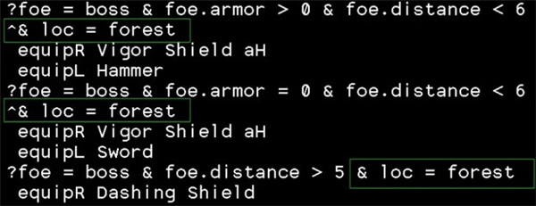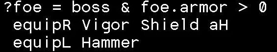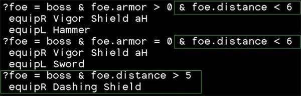 上图的这段表示,当目标为boss,且目标护甲大于0时,右手装备盾,左手装备锤子。