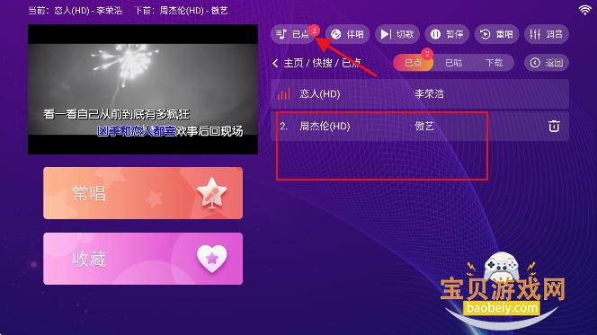 4、点击歌名,然后就可以在已点中查看已经点好的歌曲