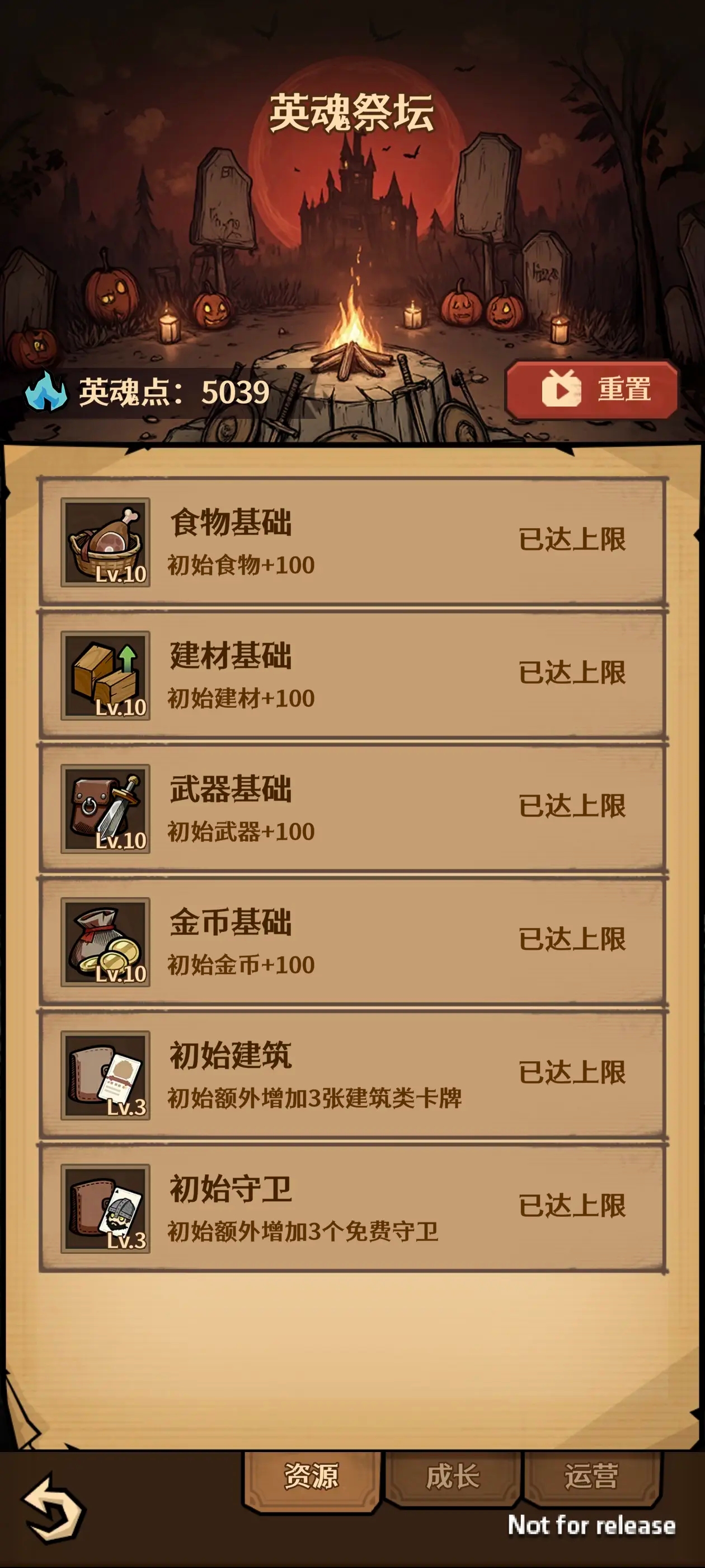 3、在进行完第一回合之后保存退出然后重置英魂点数,再将必须品出手卡牌额外收益点满,点第二页的食物提产和建筑提产,剩下都点攻击提升,生命提升。