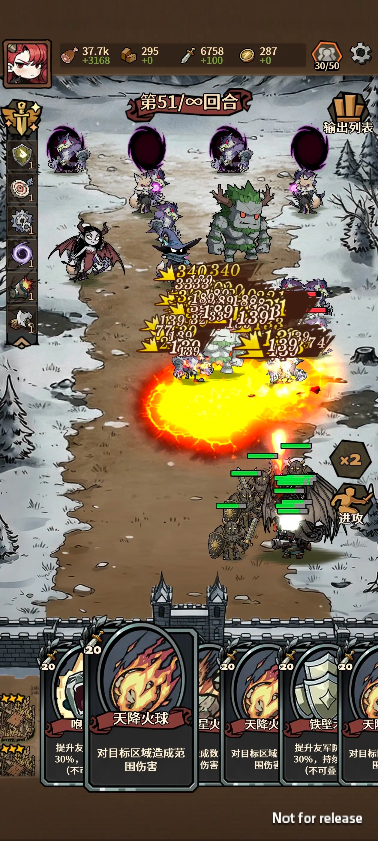 2、无尽模式我们首要的便是长期的资源收入,我们是需要龙进行主力输出,其余只需几个前排泰坦,几个辅助:火炮手对近距离敌人击退,吟游诗人给盾,祭祀加防御(有宝箱天赋的可以清楚负面效果)。
