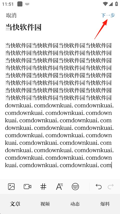 2、输入想要投稿的内容,可以在下方添加视频图片链接等,接着点击下一步;