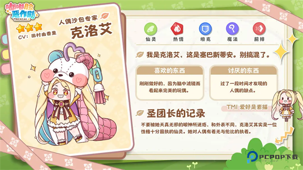 热情仙灵系魔法坦克,总站在队伍最前排。初次见面请认准她怀里的人偶:“我是克洛艾,这是塞巴斯蒂安。别搞混了”—— 这句声明可得牢记!