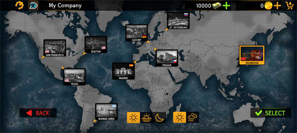 3、选择你想要去的地区,游戏内有各种现实的城内和城外地图:美国(旧金山和德克萨斯)、南美洲(布宜诺斯艾利斯)、欧洲(德国、西班牙、布拉格、圣彼得堡)、迪拜、上海等等,还可以在下方选择当前地区一天中的多个时间和天气条件,点击SELECT即可。